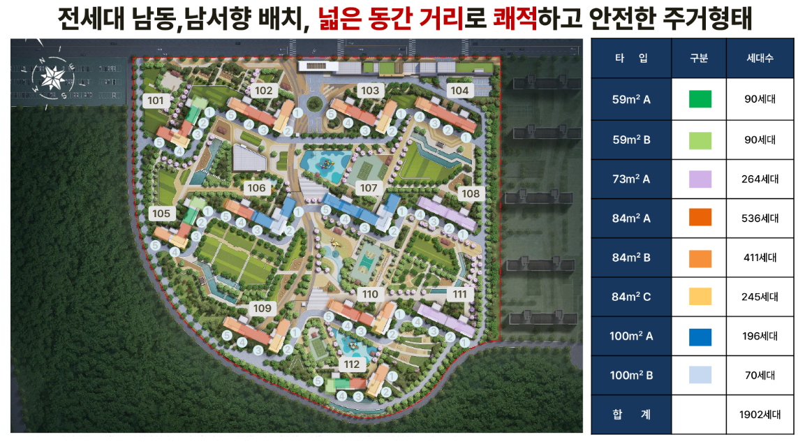 실거주자들의 다양한 니즈를 충족하기 위해 59㎡ 소형 평수부터 100㎡ 대형 평수까지 선택 가능합니다. - 역세권, 학세권, 공세권, 숲세권의 입지