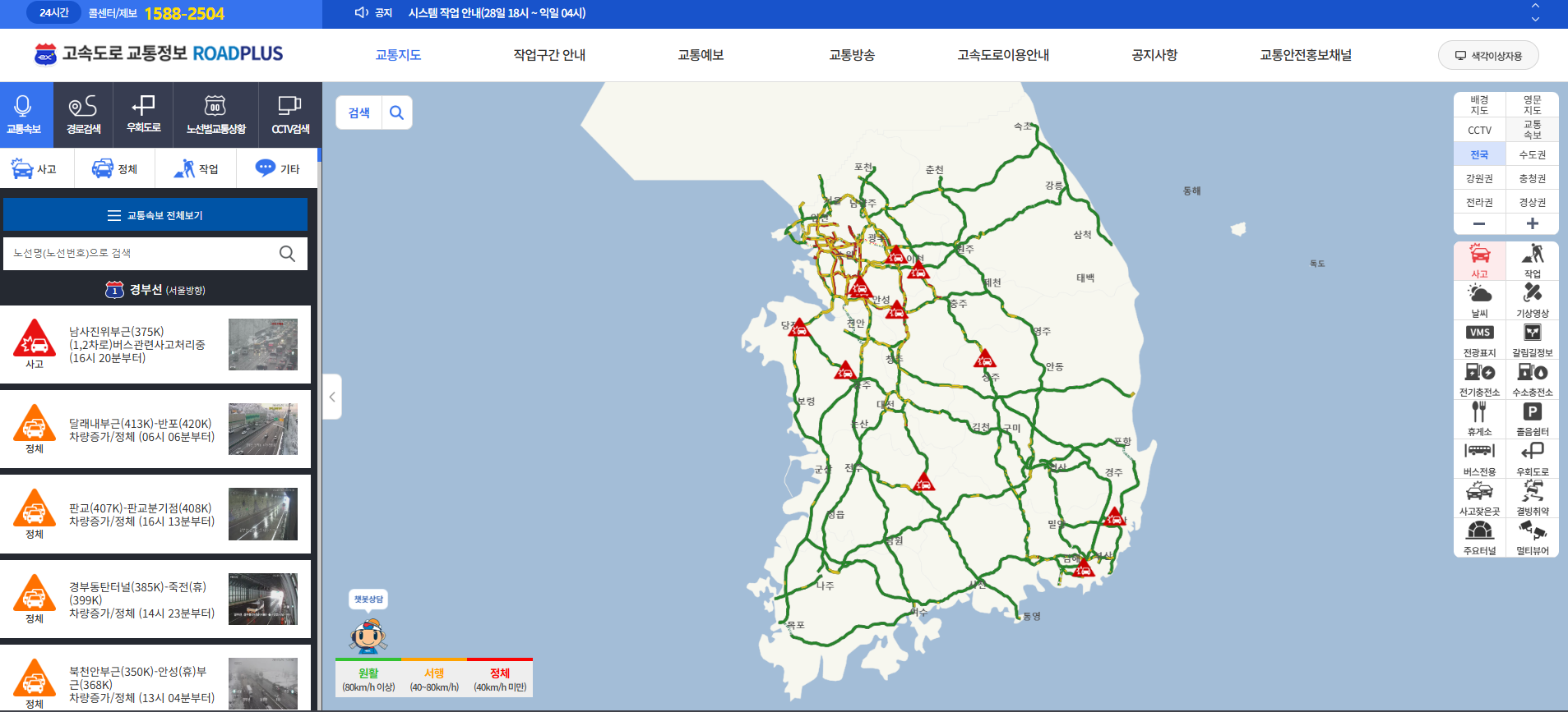 주요 구간에 설치된 실시간 CCTV 영상을 통해 현재 도로 상태를 눈으로 직접 확인할 수 있습니다. 이는 정체 구간의 길이나 사고 현황을 정확히 파악하는 데 유용합니다. - 사고정보
