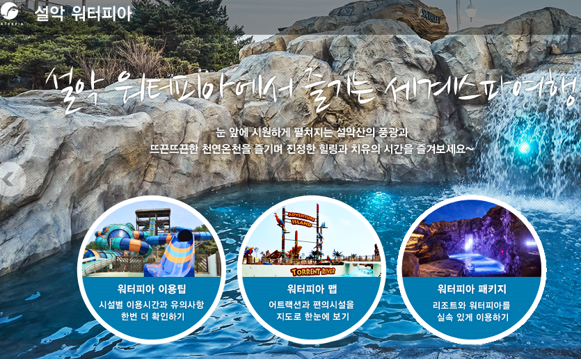 강원도 속초에 위치한 설악 워터피아는 매일 3000톤의 천연 온천수를 사용하는 온천 테마파크입니다. 설악산의 자연 속에서 다양한 테마탕을 즐길 수 있으며, 가족과 친구와 함께 재미있는 시간을 보낼 수 있는 온천 리조트입니다. 특히 겨울철 눈 덮인 설악산을 배경으로 한 노천탕은 감성 가득한 풍경을 선사합니다.