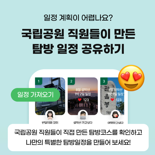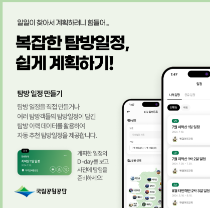 국립공원 탐방 경험을 최대화하기 위해 탐방 일정 만들기 기능이 포함되어 있습니다. 국립공원 직원이 추천하는 일정표와 각종 시설 및 축제 정보를 참고해 개인 맞춤형 일정을 구성할 수 있습니다. 이를 통해 더욱 체계적으로 공원 탐방을 계획할 수 있으며, 일정을 사전에 조정해 원하는 코스와 체험을 놓치지 않고 즐길 수 있습니다.
