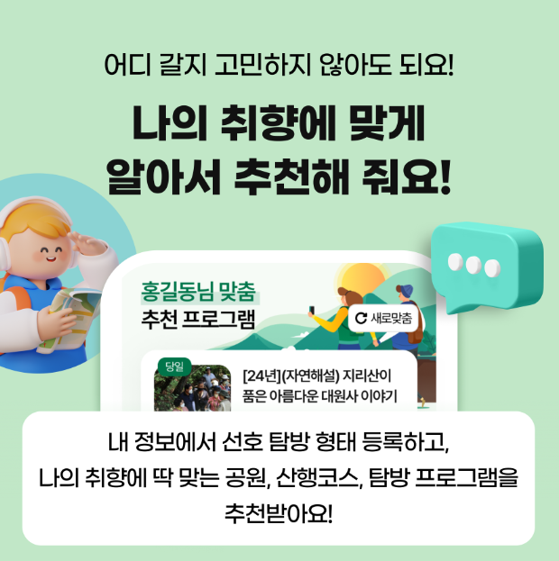 - 사용자가 선호하는 지역이나 활동을 바탕으로 맞춤형 탐방 코스와 활동 프로그램을 추천하는 기능입니다.
