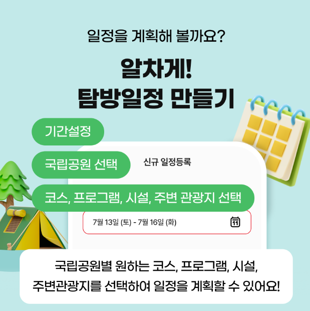| 나만의 일정표 만들기 | 방문 기간과 공원 선택 탐방로, 프로그램, 운영시설 등 선택하여 일정 구성 국립공원공단 직원 작성 일정 참고 가능 |