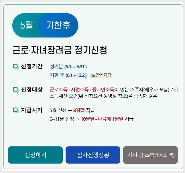 - 근로소득 또는 사업소득이 있는 경우: 근로소득자 또는 자영업자로, 소득 요건을 충족하는 자가 기한 후 신청을 할 수 있습니다.