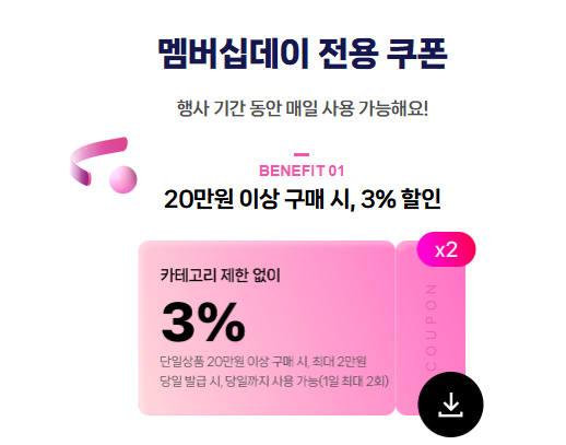 - 멤버십데이 쿠폰 할인과 카드 제휴 할인은 동시에 적용 가능하므로, 두 가지 혜택을 모두 활용하는 것이 좋습니다.