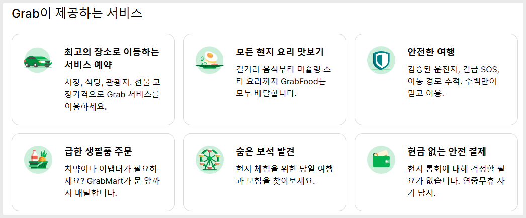 그랩은 다양한 서비스를 제공하고 있어, 필요에 따라 맞춤형 이용이 가능합니다. 그랩의 대표적인 서비스로는 차량 호출, 음식 배달, 쇼핑 배송 등이 있습니다.