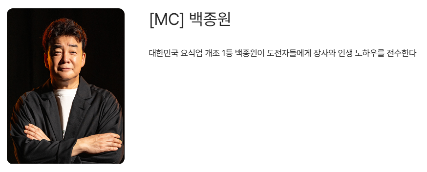 - 프로그램의 중심이자, 도전자들에게 요리와 사업 노하우를 직접 전수.