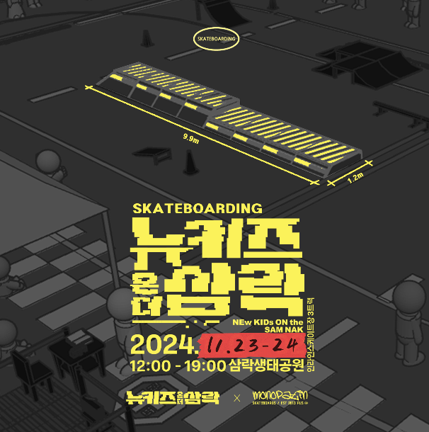 2024년 11월, 부산 삼락공원이 역동적인 스트릿 컬처의 중심지로 변신합니다. 뉴키즈 온더 삼락 페스티벌은 로컬 브랜드, 예술, 음악, 스케이트보드 문화를 한자리에서 경험할 수 있는 부산 최대의 스트릿 축제입니다. 다양한 콘텐츠와 흥미진진한 이벤트가 준비된 이번 축제는 지역 주민뿐만 아니라 스트릿 문화를 사랑하는 사람들에게 색다른 경험을 선사할 예정입니다.
