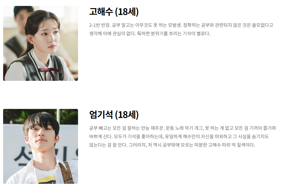 - 고해수: 독목고 2학년 1반 반장 (18세, 여)