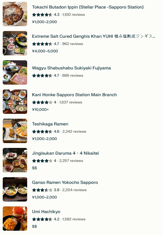수프 카레, 징기스칸 요리, 삿포로 라멘, 신선한 해산물 요리가 삿포로를 대표하는 음식입니다.