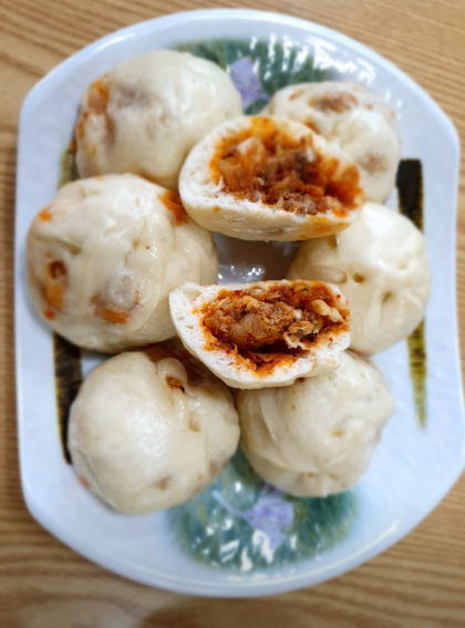 매콤한 김치소가 듬뿍 들어간 김치왕만두는 매콤한 맛을 선호하는 분들에게 강력 추천합니다. 매콤하면서도 감칠맛 나는 김치소가 입맛을 돋웁니다.
