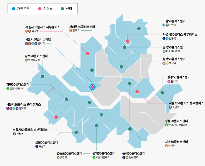서울시 50플러스센터는 만 50세부터 64세까지의 중장년층을 대상으로 생애 재설계, 직업 교육, 일자리 지원 등 다양한 서비스를 제공하는 기관입니다. 서울시 전역에 걸쳐 여러 캠퍼스와 센터를 운영하며, 중장년층의 사회적 참여와 삶의 질 향상을 목표로 하고 있습니다.