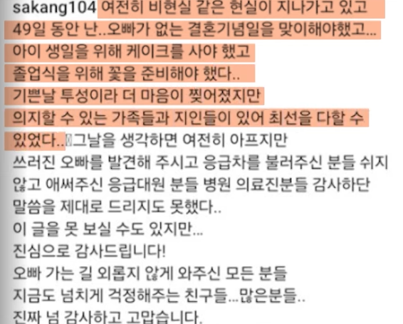- 사강은 "응급차를 불러주신 분들과 의료진께 감사하다"는 내용을 통해 남편이 집이 아닌 다른 장소에서 갑작스럽게 쓰러졌음을 암시했습니다.
