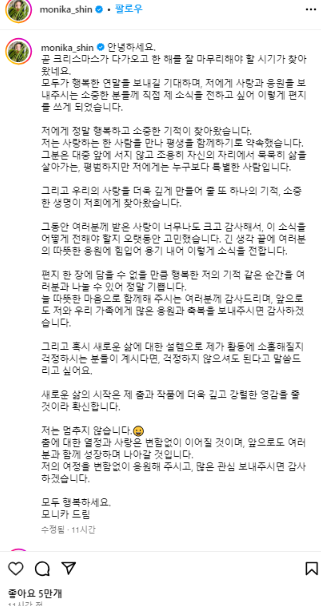 - "새로운 시작을 응원합니다. 모니카님의 춤이 더 깊어질 것 같아요."