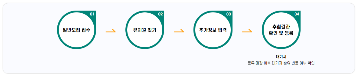 | 자동접수 | - 우선모집 탈락 시 일반모집 자동접수 가능 - 유치원 설정에 따라 자동접수 안 될 수 있음 - 접수결과 재확인 필요 |