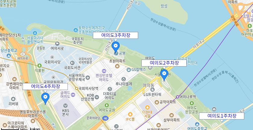 - 여의도 한강공원 1주차장: 다소 거리가 멀어 다른 주차장이 만차일 경우 이용 가능합니다.