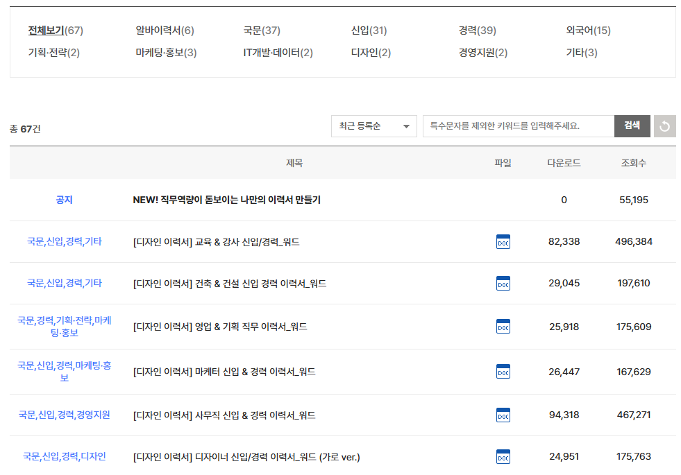 사람인은 잡코리아와 함께 대표적인 취업 플랫폼으로, 다양한 이력서 템플릿과 자소서 예시 자료를 무료로 제공하고 있습니다. 또한, 사람인의 이력서 양식은 신입, 경력직을 위한 맞춤형 양식을 제공하여 자신의 경력 단계에 따라 적절한 템플릿을 선택할 수 있습니다. 각 템플릿은 직무나 산업에 특화되어 있어 간편하게 사용하기 좋습니다.