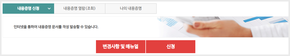 - 메인 메뉴에서 ‘내용증명’ 선택