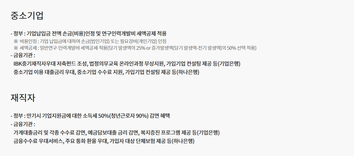 재직자 혜택 | - 기업지원금: 납입금의 20% - 우대금리: 약 5% 수준 (1~2%p 우대) - 만기 시 기업지원금에 대한 소득세 50% 감면 (청년근로자 90%) - 가계대출금리 및 각종 수수료 감면 - 예금담보대출 금리 감면 - 복지증진 프로그램 제공 |