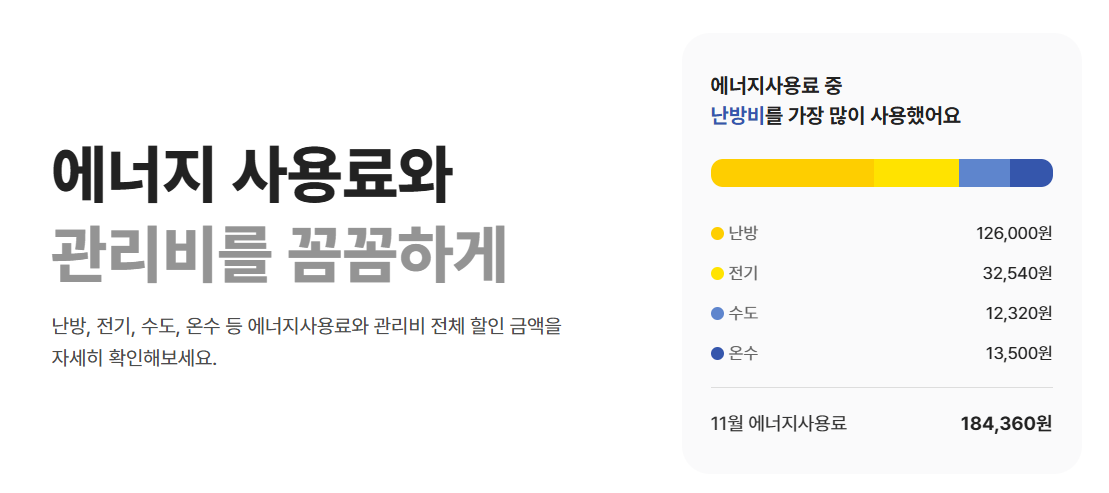 - 전기, 수도, 온수 등 에너지 사용료도 투명하게 조회 가능.