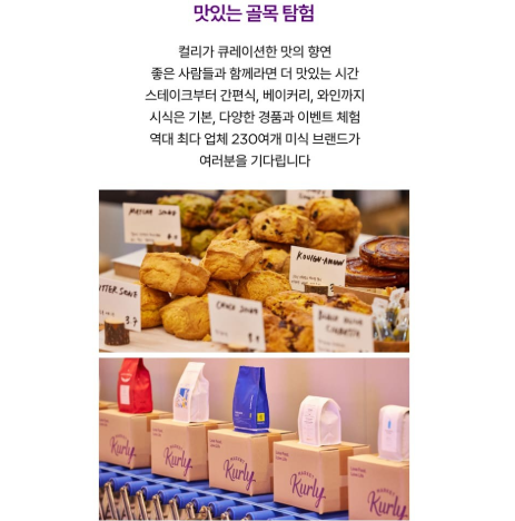 - 컬리 브랜드관: 다양한 테마 공간에서 독특한 체험을 즐길 수 있습니다.