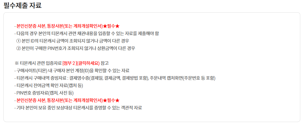 - 티몬 캐시 관련 증빙 자료: 다음 자료들을 준비하여 자신의 티몬 캐시 잔액을 증빙할 수 있습니다.