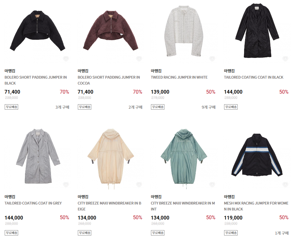- 특히 마뗑킴의 베스트셀러 제품과 계절에 맞는 최신 컬렉션도 할인 대상에 포함되어 있어 실용적이고 스타일리시한 쇼핑을 즐길 수 있습니다.