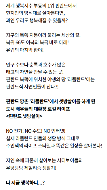 A: 핀란드 라플란드의 한적한 시골 마을에서 촬영되었습니다. 이곳은 전기, 수도, 와이파이가 없는 환경으로 자연 속에서 자급자족하며 살아가야 하는 곳입니다. - Q: 프로그램의 가장 큰 매력은 무엇인가요?