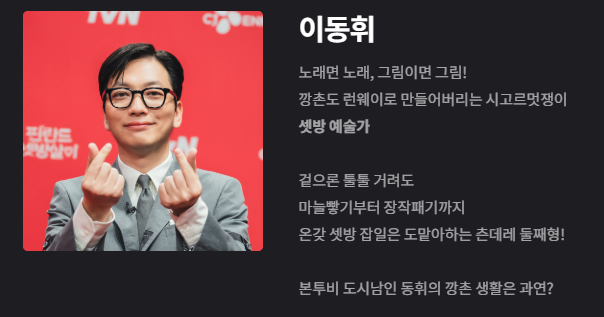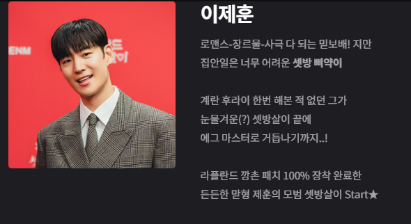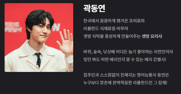 셋방살이의 ‘잡일 마스터’ 이동휘는 프로그램의 중심축 역할을 합니다. 불을 지피고, 요리를 하고, 필요한 일을 척척 해내는 그의 능숙함은 팀 전체를 안정감 있게 만들었습니다. 이동휘 특유의 유머러스한 성격은 상황을 밝게 만들고, 그의 인간적인 매력은 시청자들에게 따뜻한 인상을 남깁니다.