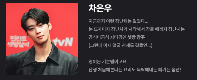 차은우는 출연진 중 가장 막내로 등장하며, 모든 이들을 끌어당기는 ‘자석남’으로 활약합니다. 특유의 맑은 이미지와 따뜻한 행동으로 형들에게 힘이 되는 존재감을 발휘하며 프로그램의 감초 역할을 톡톡히 하고 있습니다.