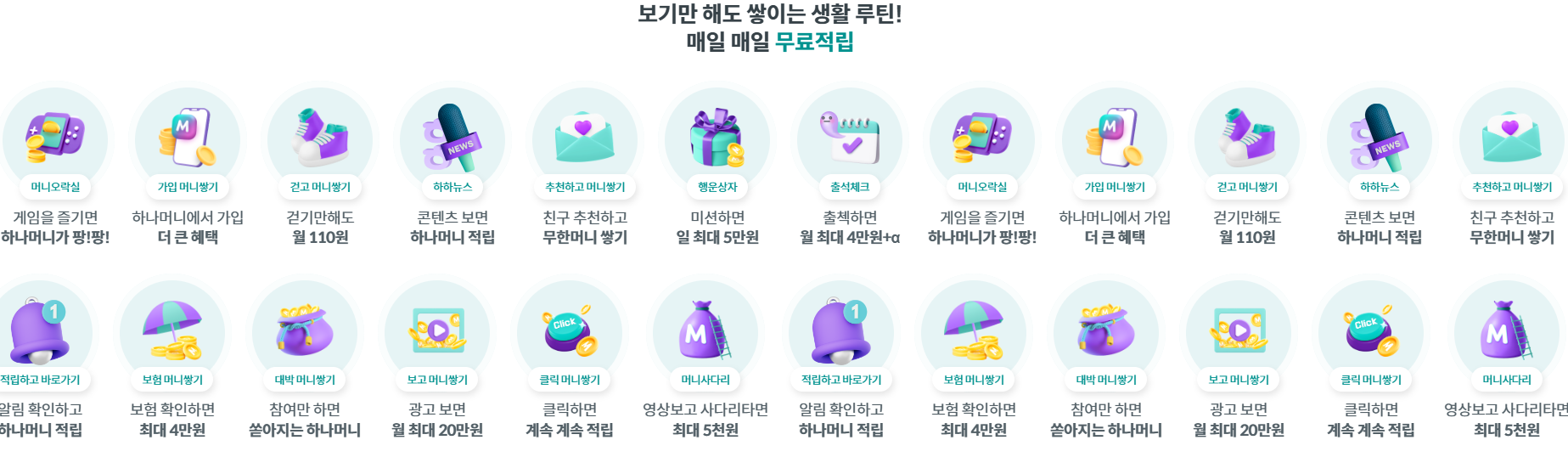 | 출석체크 | 출석체크 참여 시 1천 명 추첨 2천 하나 머니 적립 |