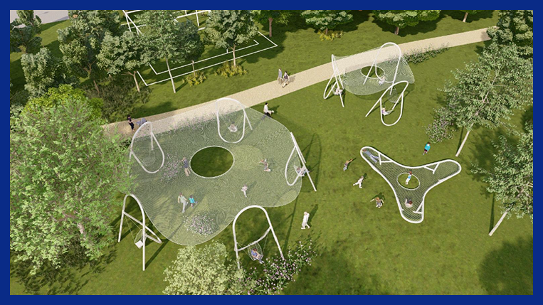 해먹 공간은 공원의 지형과 그물 소재를 활용하여 바람에 흔들리는 그물 지붕이 특징입니다. 사용자는 이곳에서 가을 하늘을 감상하며 여유로운 시간을 보낼 수 있습니다
