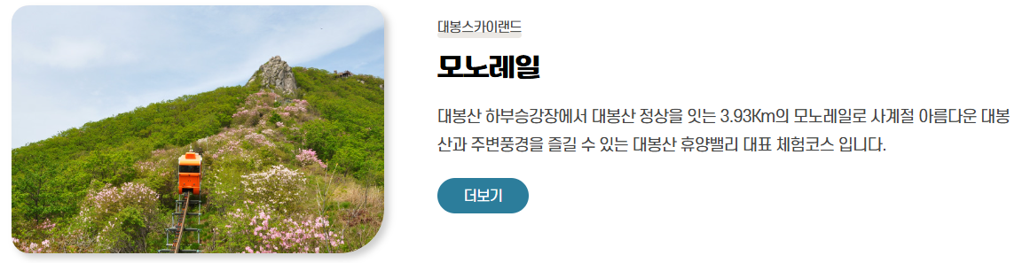 모노레일은 산길을 따라 완만하게 이동하며 대봉산의 자연을 즐길 수 있는 편안한 체험입니다. 특히 어르신이나 어린이도 쉽게 이용할 수 있어 가족 단위 관광객들에게 인기가 많습니다. 모노레일은 일반 등산로와는 다르게 산길을 천천히 오르내리며 풍경을 감상할 수 있어 힐링 여행을 원하는 분들에게 적합합니다.