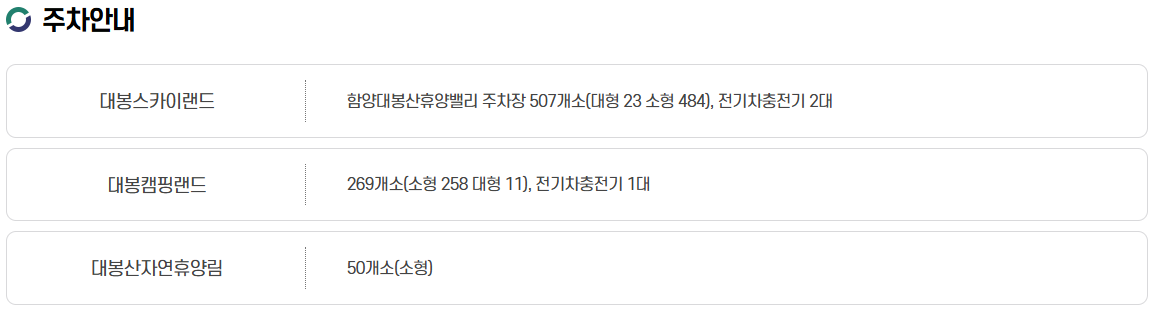 | 함양대봉산휴양밸리 주차장 | 총 507개 (대형 23개, 소형 484개) |