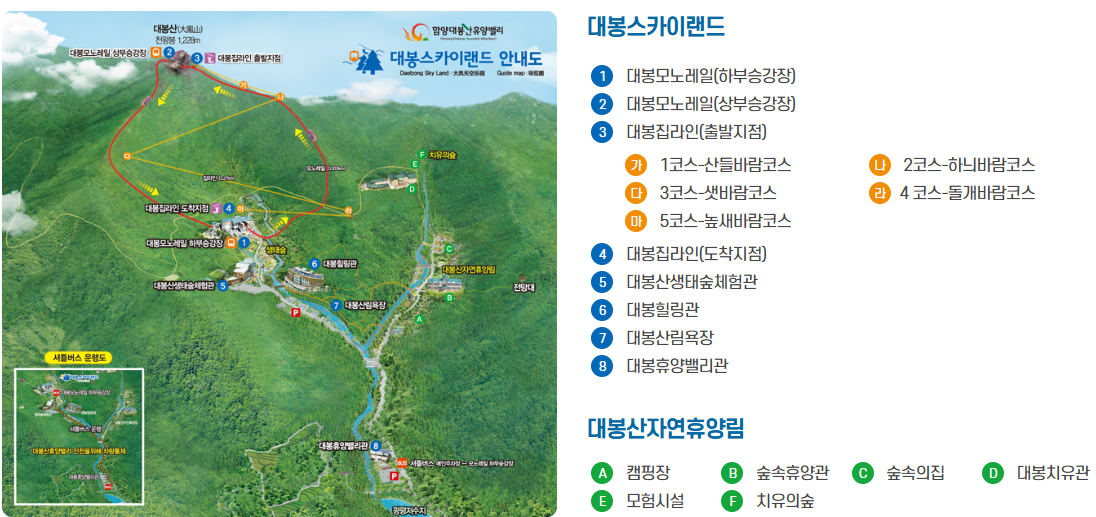 - 대봉모노레일과 집라인 이용객은 함양대봉산휴양밸리 주차장에 주차 후 무료 셔틀버스를 이용해야 합니다.