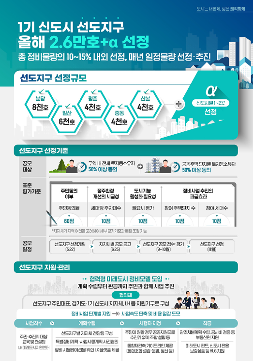 1기 신도시의 재건축은 오랜 시간 동안 많은 이들의 관심을 받아왔습니다. 이제 국토교통부가 발표한 1기 신도시 선도지구 선정 결과로 재건축의 첫걸음이 시작되었습니다. 이번 발표는 분당, 일산, 평촌, 중동, 산본 등 주요 신도시에 걸쳐 진행되며, 총 13개 구역, 약 3만 6,000가구 규모의 사업이 포함됩니다. 이번 포스팅에서는 선도지구 선정 결과와 주요 단지, 그리고 정부의 지원 계획을 상세히 살펴보겠습니다
