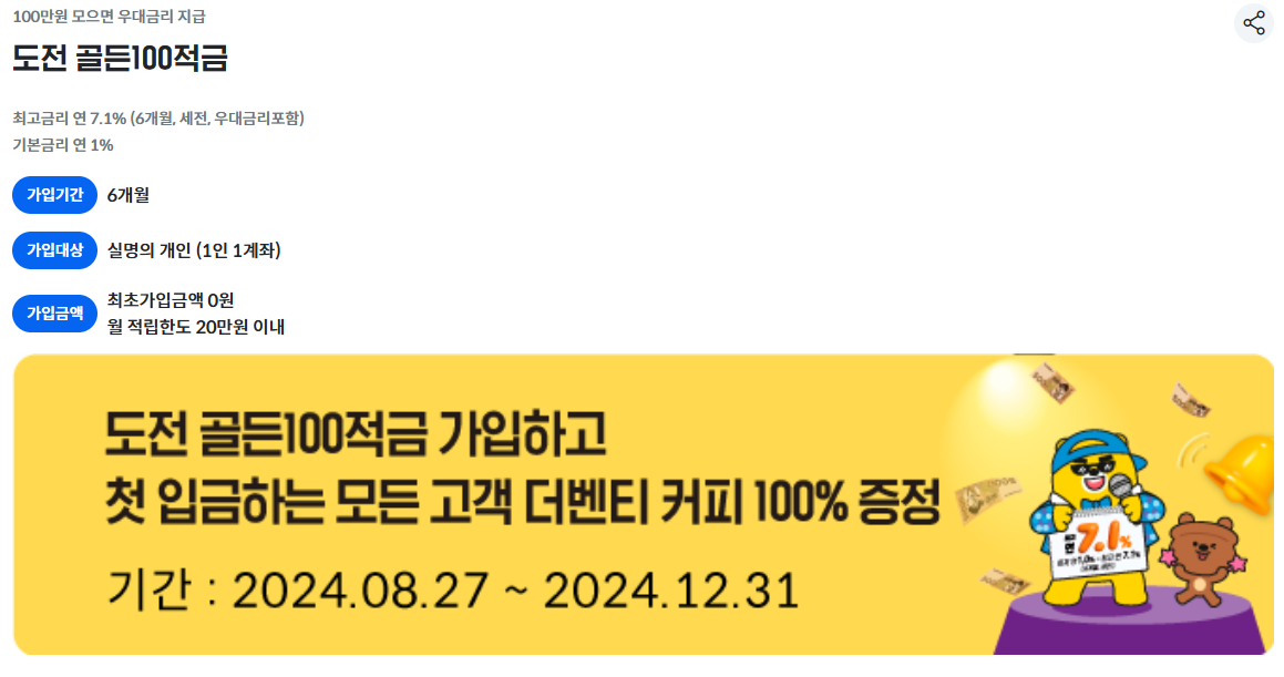 짧은 기간 동안 높은 금리를 받을 수 있는 단기 적금 상품으로, 금리 혜택이 뛰어나며, 빠르게 목돈을 모으려는 분들에게 적합합니다.