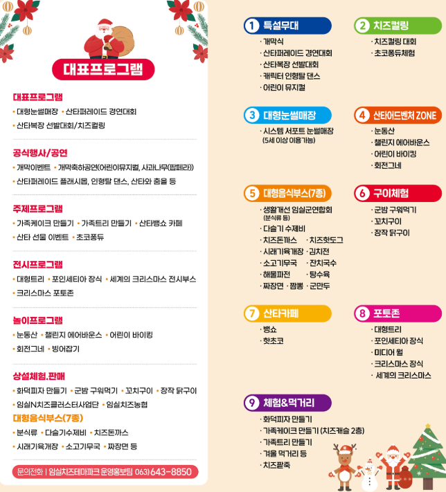 임실산타축제는 가족과 함께 따뜻한 겨울을 보낼 수 있는 완벽한 선택입니다. 눈썰매장, 크리스마스 트리, 지역 특산 먹거리 등 다양하고 풍성한 콘텐츠로 가득한 이번 축제를 놓치지 마세요. 임실치즈테마파크에서 특별한 겨울 추억을 만들어보시길 바랍니다.