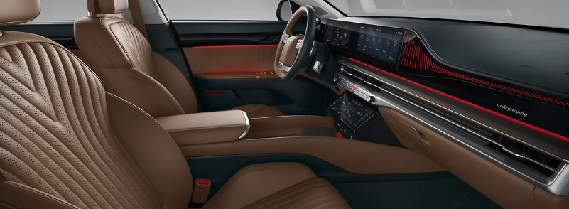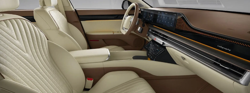프리미엄 가죽 소재와 대형 디스플레이 패널이 적용된 인테리어는 고급스러운 분위기를 자아냅니다. 파노라마 선루프와 앰비언트 라이트도 기본 사양으로 제공됩니다.