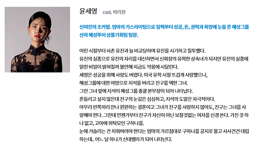- 조카딸 윤세영은 신여진의 실종된 딸 자리를 대신하며 상속녀로 성장했습니다.