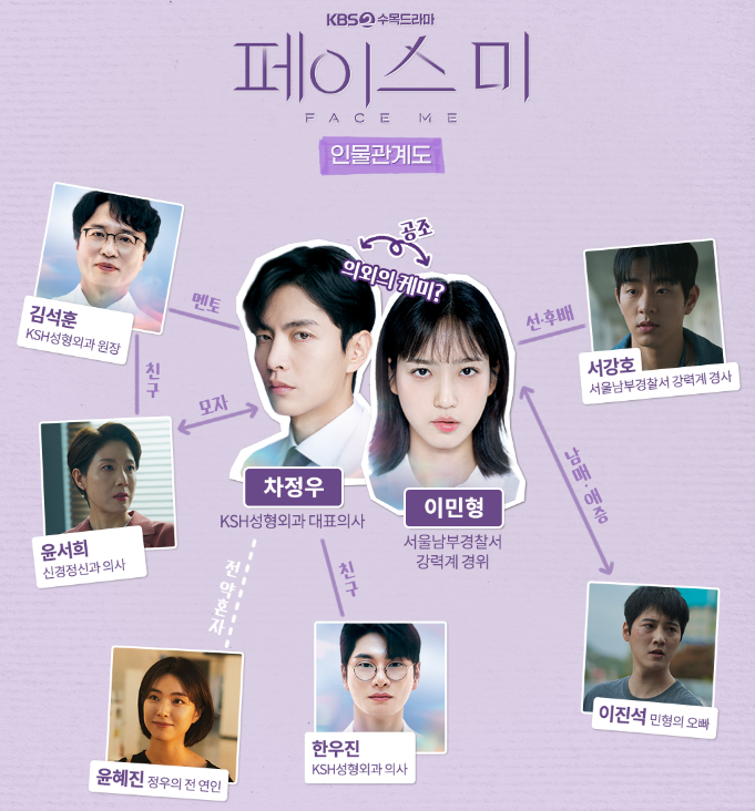 페이스미는 각기 다른 배경과 성격을 가진 인물들이 사건 속에서 얽히며 다채로운 갈등과 관계 변화를 보여줍니다. 성형외과 의사와 형사라는 대조적인 직업을 가진 주인공들이 서로의 신념과 욕망을 마주하면서, 드라마는 극적 긴장감을 극대화합니다.