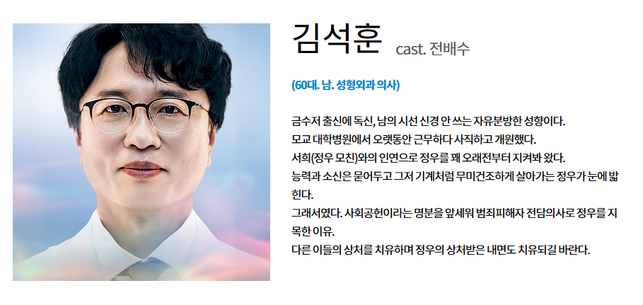 김석훈은 KSH 성형외과의 원장이자 성형외과 업계에서 독보적인 인물입니다. 병원 운영을 위해 다방면으로 활동하는 그는, 차정우가 재건 성형을 통해 범죄 피해자들과 연관된 사건에 엮이게 되면서 사건의 중심에 서게 됩니다. 전배수는 병원장으로서의 강렬한 존재감을 발휘하며, 드라마 속에서 차정우의 조력자이자 병원의 대표로서 독특한 매력을 선보일 예정입니다.
