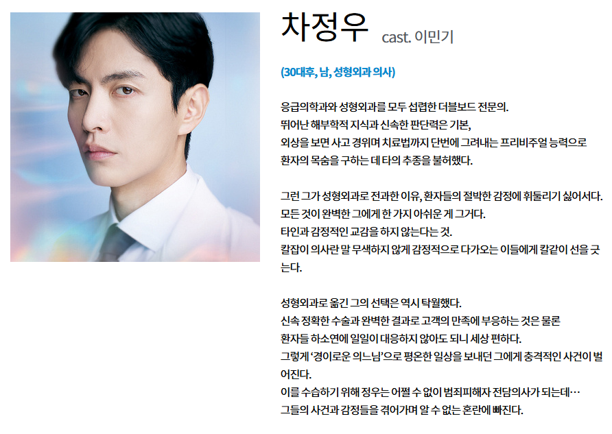 차정우는 냉철하면서도 뛰어난 실력을 자랑하는 성형외과 의사입니다. 그의 삶은 예기치 못한 사건에 휘말리면서 완전히 뒤바뀌게 되고, 결국 범죄 피해자들을 위한 재건 성형을 맡아 사건의 진실을 추적하게 됩니다. 차정우는 전문 의사로서의 철저함을 지닌 캐릭터로, 이민기의 섬세한 연기력이 더해져 강렬한 캐릭터로 그려질 예정입니다.