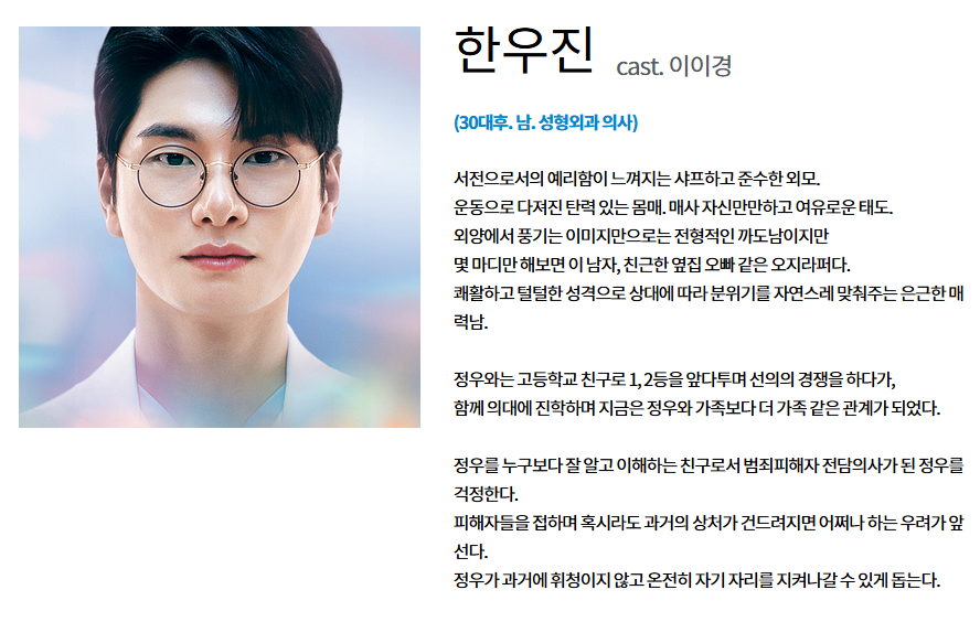 한우진은 차정우의 오랜 친구이자, 같은 성형외과에서 일하는 동료 의사입니다. 두 사람은 과거의 인연으로 긴밀한 관계를 유지하고 있지만, 차정우가 범죄 피해자 재건 성형을 맡게 되면서 서로의 가치관이 충돌하기도 합니다. 특히, 한우진은 사건의 위험성을 우려하며 차정우에게 걱정을 표현하기도 하고, 그의 과거 트라우마에 대해서도 염려를 나타냅니다. 두 사람의 관계는 단순한 우정을 넘어선 복잡한 감정으로 얽혀 있으며, 이를 통해 시청자들은 인간적인 갈등과 복잡한 관계 속에서 차정우의 성장을 지켜볼 수 있습니다.