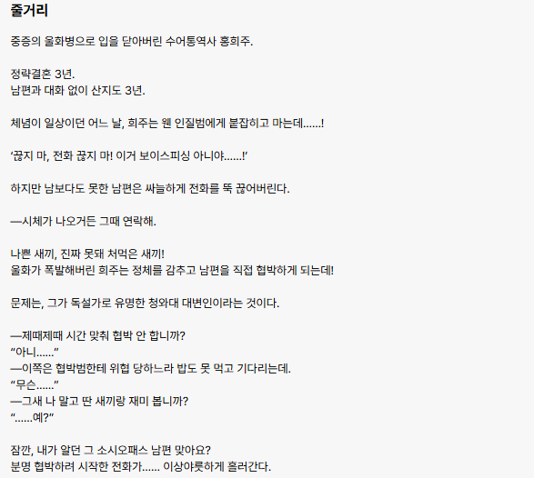 | 줄거리 | 협박 전화로 인해 정략결혼 부부의 관계가 변화하는 이야기 |