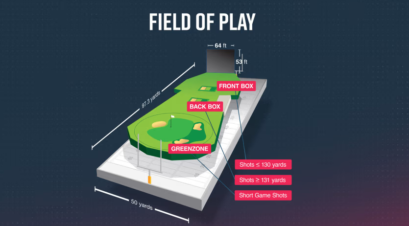 - 대형 스크린(3400평방피트)에서 티샷과 아이언 샷을 실행하며, 50야드 이내의 실제 그린과 어프로치 구역에서 플레이가 진행됩니다.